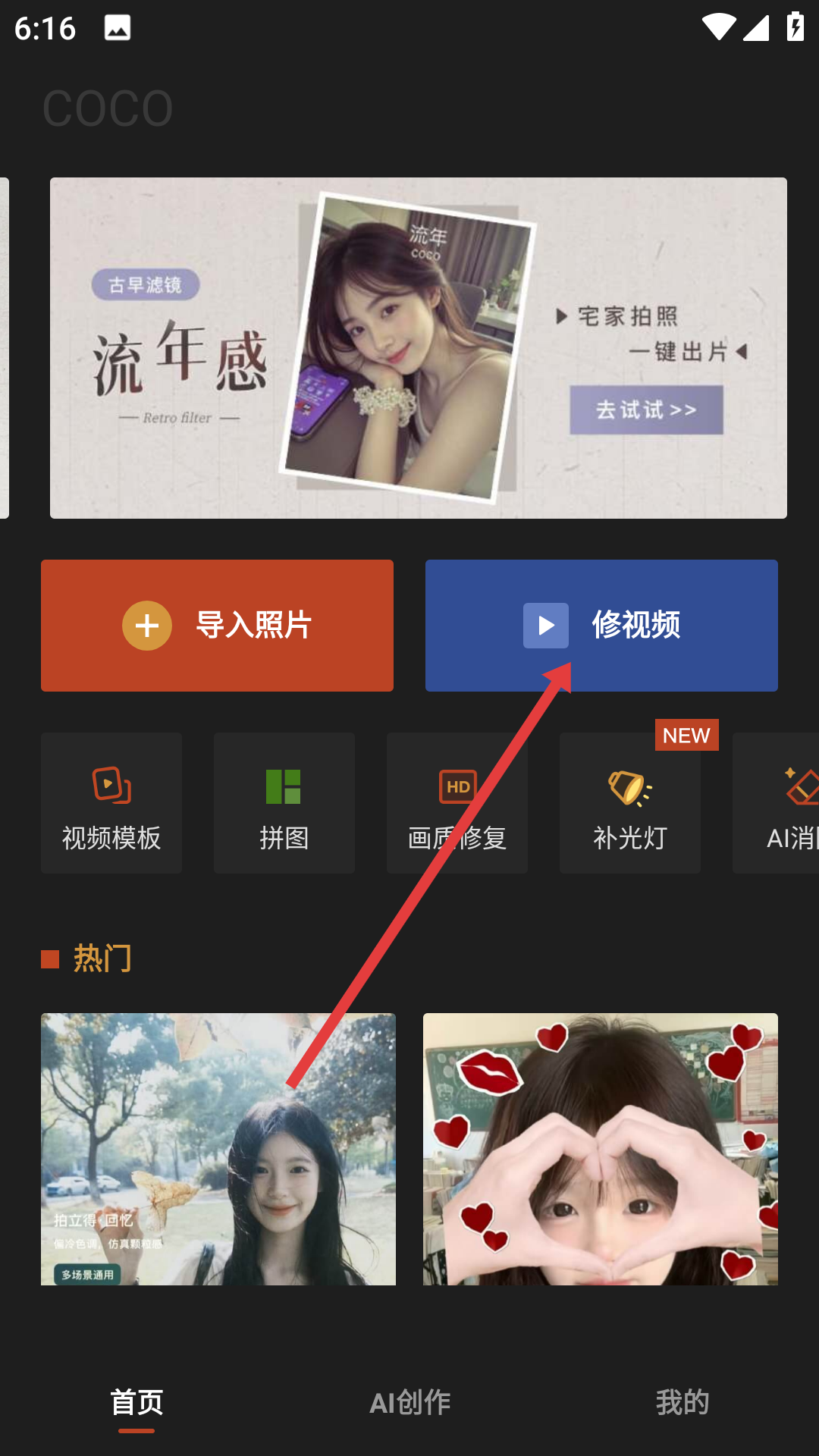 1、在首頁找到修視頻按鈕并點擊,這一步是進入視頻修復(fù)流程的入口,點擊后就能選擇需要修復(fù)、美化的視頻素材,開啟對視頻的創(chuàng)作加工。
