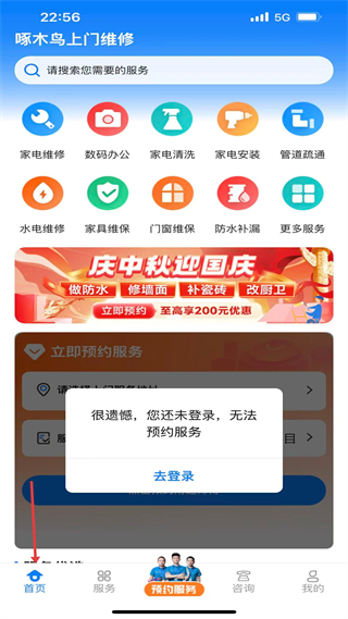 1、首頁功能入口含家電維修、數(shù)碼辦公等,有慶中秋迎國慶活動,未登錄無法預(yù)約服務(wù),需去登錄后使用。