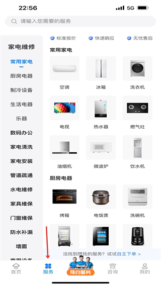 2、服務(wù)頁家電維修分常用家電、廚房電器等,涵蓋空調(diào)、冰箱等設(shè)備,沒找到服務(wù)可自主下單。
