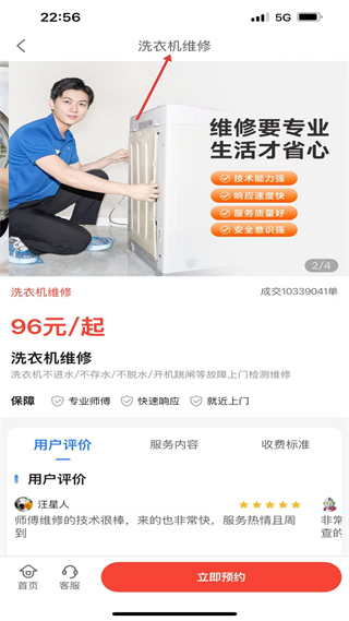 3、洗衣機(jī)維修頁,維修96元起,可解決不進(jìn)水等故障,有專業(yè)師傅、快速響應(yīng)保障,用戶評價好,可立即預(yù)約。