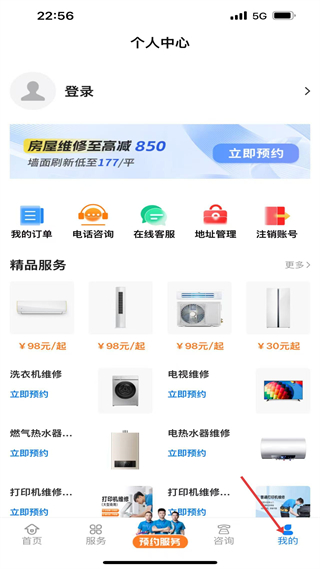 4、個人中心頁可登錄管理訂單、咨詢客服等,有房屋維修優(yōu)惠活動,精品服務(wù)含洗衣機(jī)維修等可立即預(yù)約。