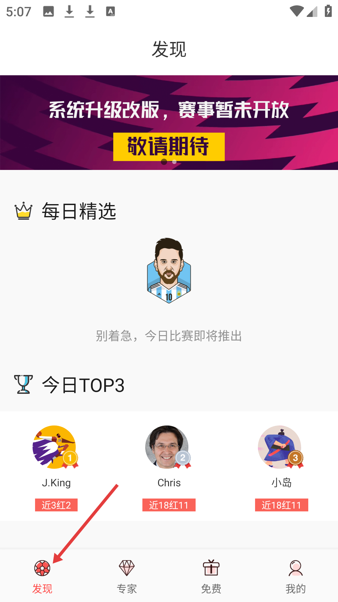 1、發(fā)現(xiàn)頁面顯示系統(tǒng)升級改版,賽事暫未開放,有每日精選今日TOP3板塊,展示相關賽事推薦及專家信息。