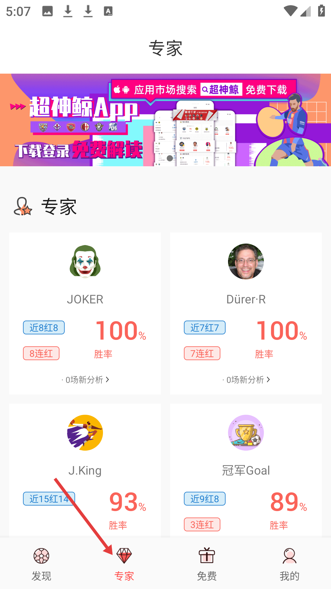 2、專家頁面推薦多位賽事分析專家,如JOKER、DürerR等,顯示他們的近期紅單率和連紅情況還推廣超神鯨App。