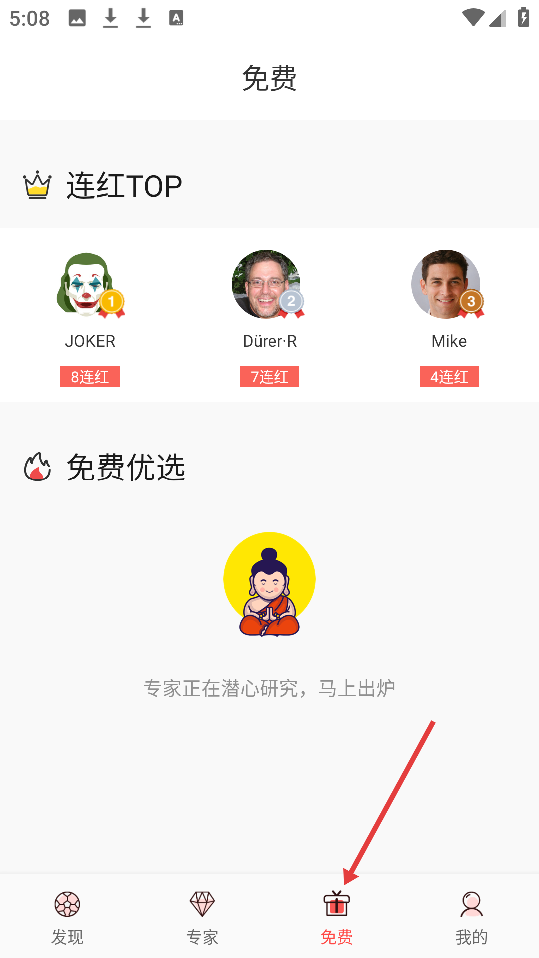 3、免費頁面有連紅TOP板塊,展示JOKER等連紅專家,免費優(yōu)選板塊提示專家研究中內(nèi)容即將出爐。
