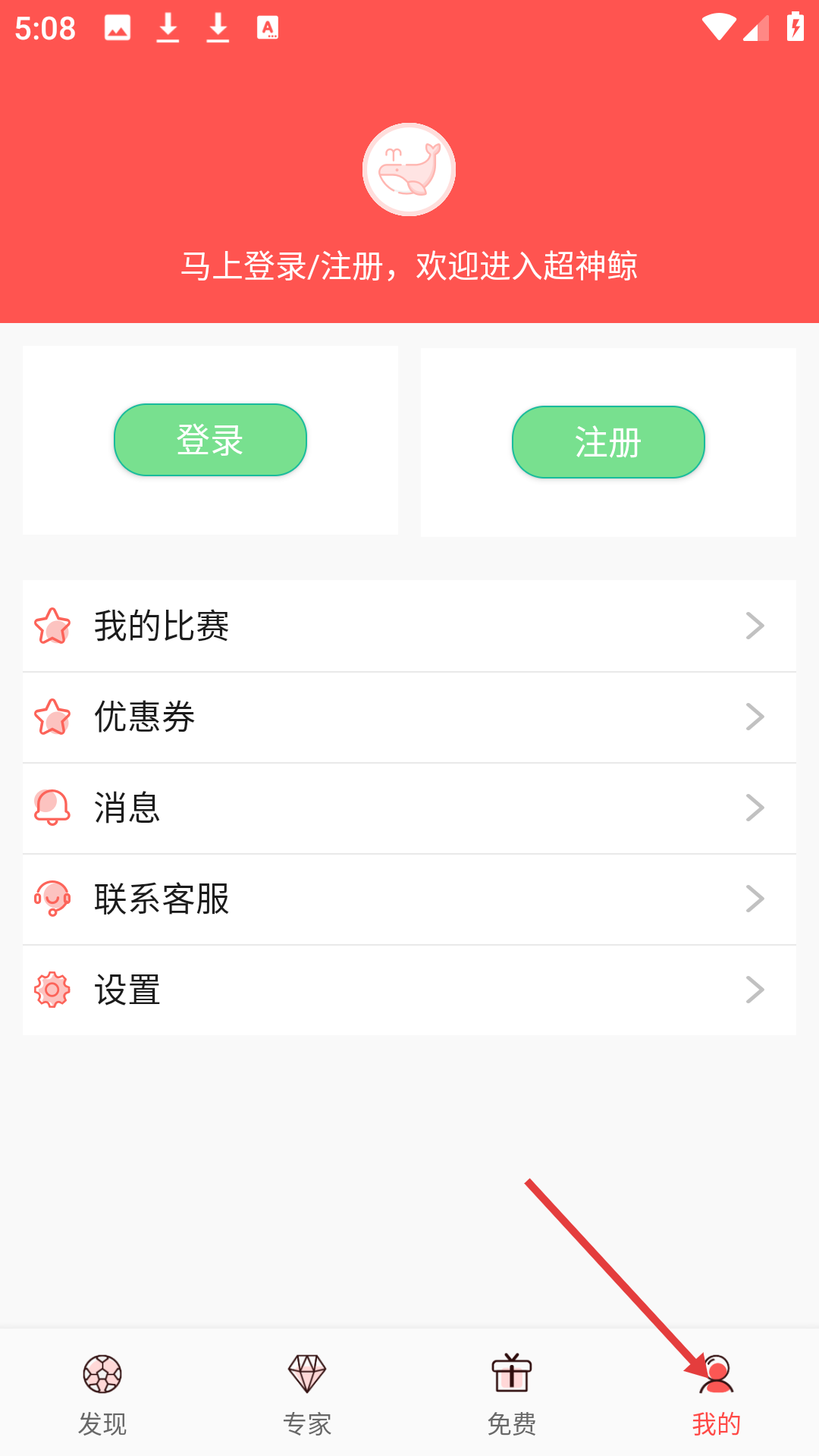 4、我的頁面屬于超神鯨App,可登錄注冊,有我的比賽優(yōu)惠券等功能入口,方便用戶管理個人相關賽事和權(quán)益。