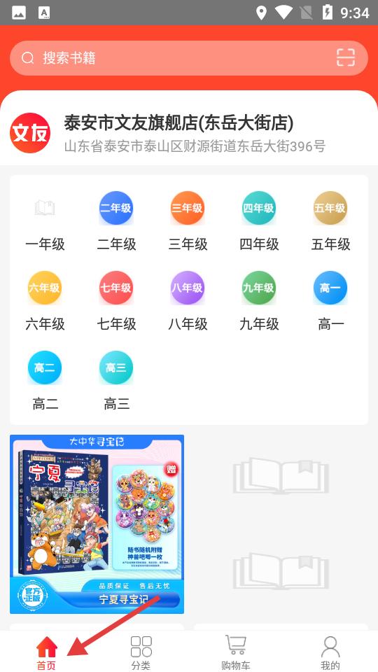 1、點(diǎn)擊首頁(yè),定位泰安市東岳大街店,有年級(jí)分類便于查找,推薦寧夏尋寶記等童書,滿是童趣。