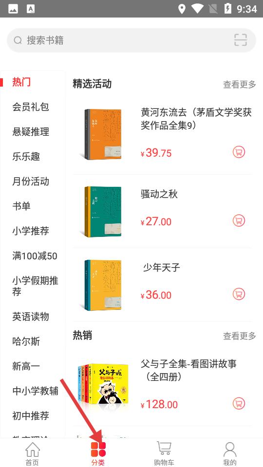 2、點(diǎn)擊分類界面含熱門、精選活動(dòng)等分區(qū),陳列黃河?xùn)|流去等書,標(biāo)明價(jià)格,滿100減50等活動(dòng)吸睛。