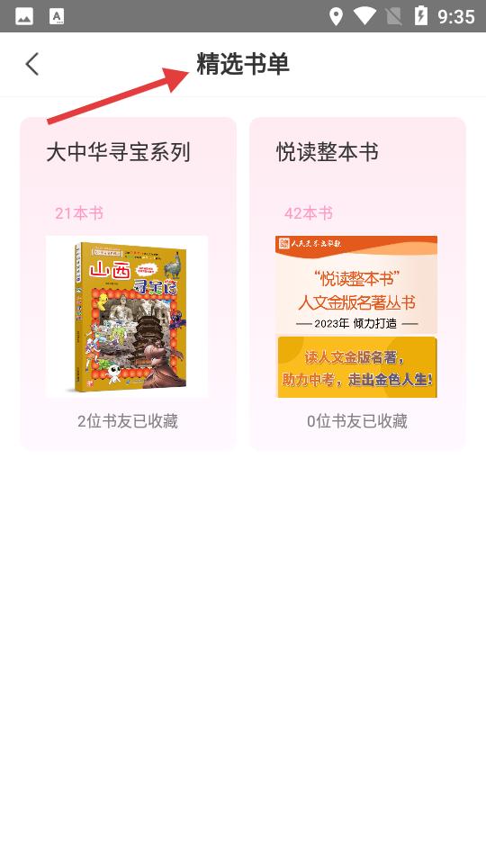 3、點(diǎn)擊精選書單頁(yè)展示大中華尋寶系列等,標(biāo)注書量與收藏?cái)?shù),悅讀整本書系列助力中考,誠(chéng)意滿滿。