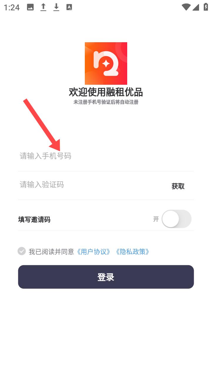 1、登錄界面簡(jiǎn)潔明了,用戶(hù)輸入手機(jī)號(hào)獲取驗(yàn)證碼,可選擇填寫(xiě)邀請(qǐng)碼,勾選協(xié)議后點(diǎn)擊登錄,未注冊(cè)手機(jī)號(hào)驗(yàn)證后自動(dòng)注冊(cè),方便用戶(hù)快速開(kāi)啟租賃服務(wù)。