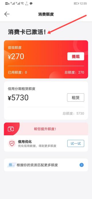 2、消費(fèi)額度頁(yè)面展示提現(xiàn)額度與信用分期租賃額度,消費(fèi)卡已激活狀態(tài)清晰,同步提供信用優(yōu)化功能助力提升額度,直觀(guān)呈現(xiàn)額度信息,方便用戶(hù)規(guī)劃租賃消費(fèi)。
