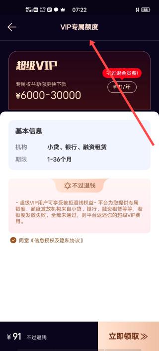 3、推出超級(jí)VIP服務(wù),年費(fèi)91元享6000到30000額度,機(jī)構(gòu)涵蓋小貸銀行融資租賃,期限1到36個(gè)月,承諾額度失敗退還會(huì)費(fèi),助力用戶(hù)獲取專(zhuān)屬權(quán)益。