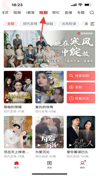 2、首頁(yè)短劇板塊有她在寒風(fēng)中綻放、隱秘的榮耀等,涵蓋現(xiàn)代言情等題材,可搜索、追劇,劇集資源豐富。