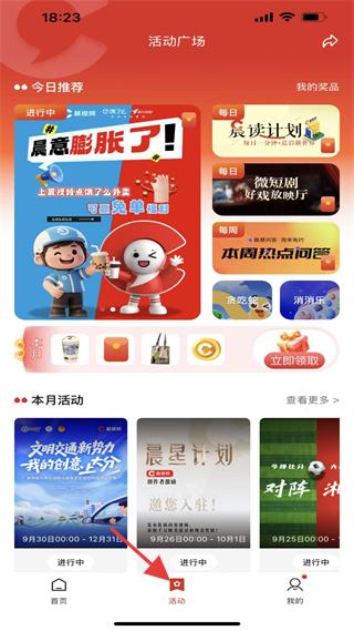 3、活動(dòng)板塊有晨意膨脹了等進(jìn)行中活動(dòng),辰讀計(jì)劃、微短劇放映廳等每日活動(dòng),本月活動(dòng)含創(chuàng)作大賽、創(chuàng)作者激勵(lì),活動(dòng)多樣。