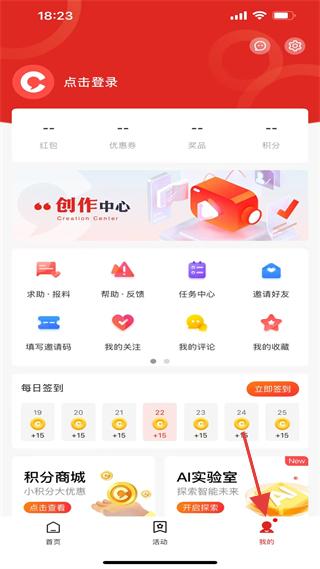 4、我的板塊可登錄,有創(chuàng)作中心、任務(wù)中心等功能,每日簽到領(lǐng)積分,還有積分商城、AI實(shí)驗(yàn)室等服務(wù),功能豐富實(shí)用。