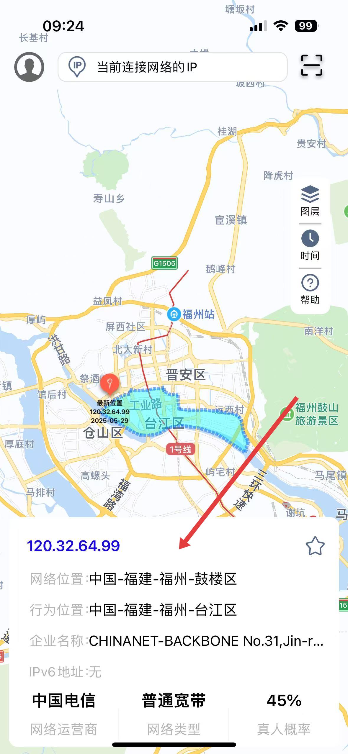 1、地圖頁(yè)面,顯示了當(dāng)前連接網(wǎng)絡(luò)的IP地址及其所在的地理位置信息,包括網(wǎng)絡(luò)位置和行為位置等。