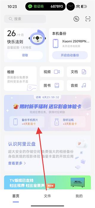 3、在首頁找到限時新手福利送你影音體驗卡活動,點擊備份手機照片任務,參與該新手福利任務。