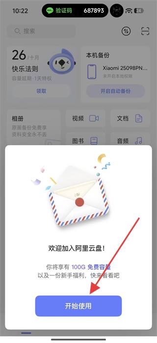 2、登錄后在歡迎加入阿里云盤的提示頁面,點擊開始使用,進入阿里云盤主界面。