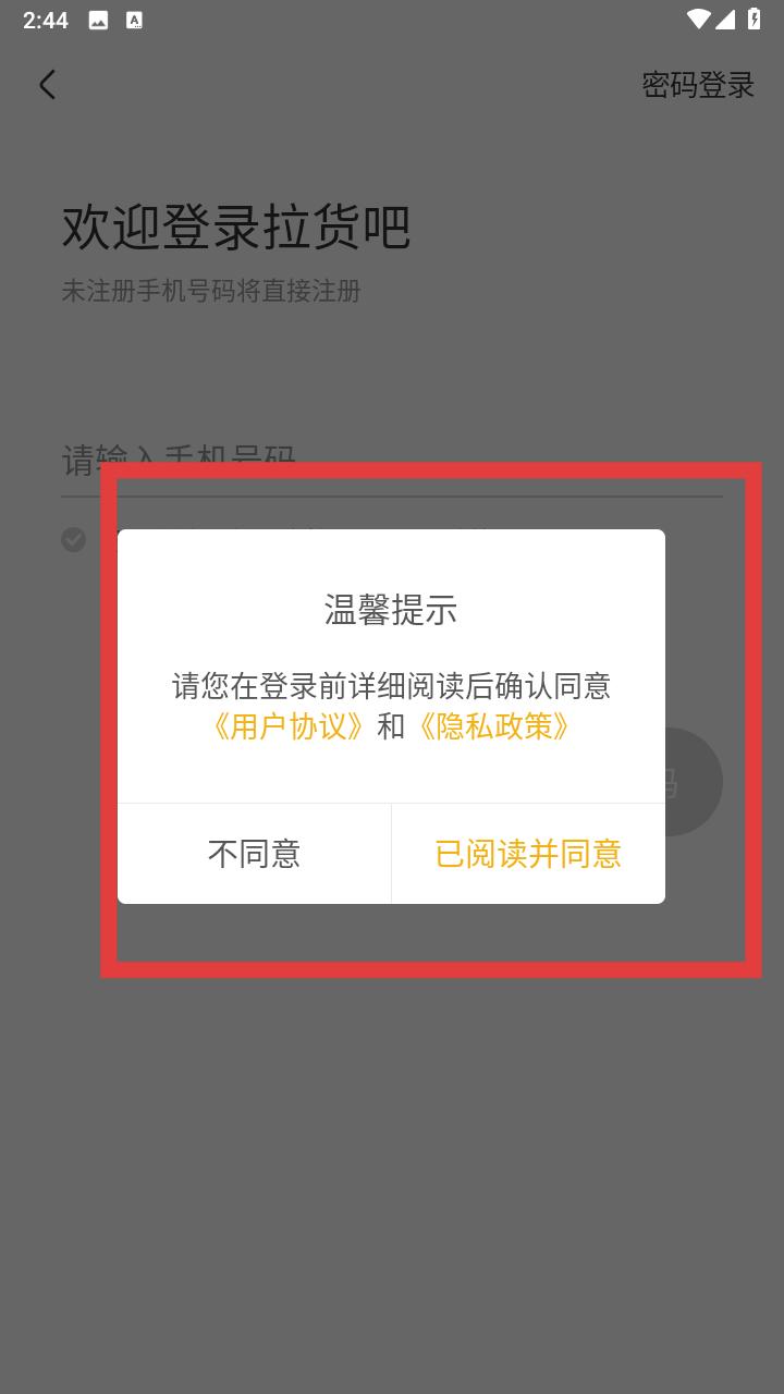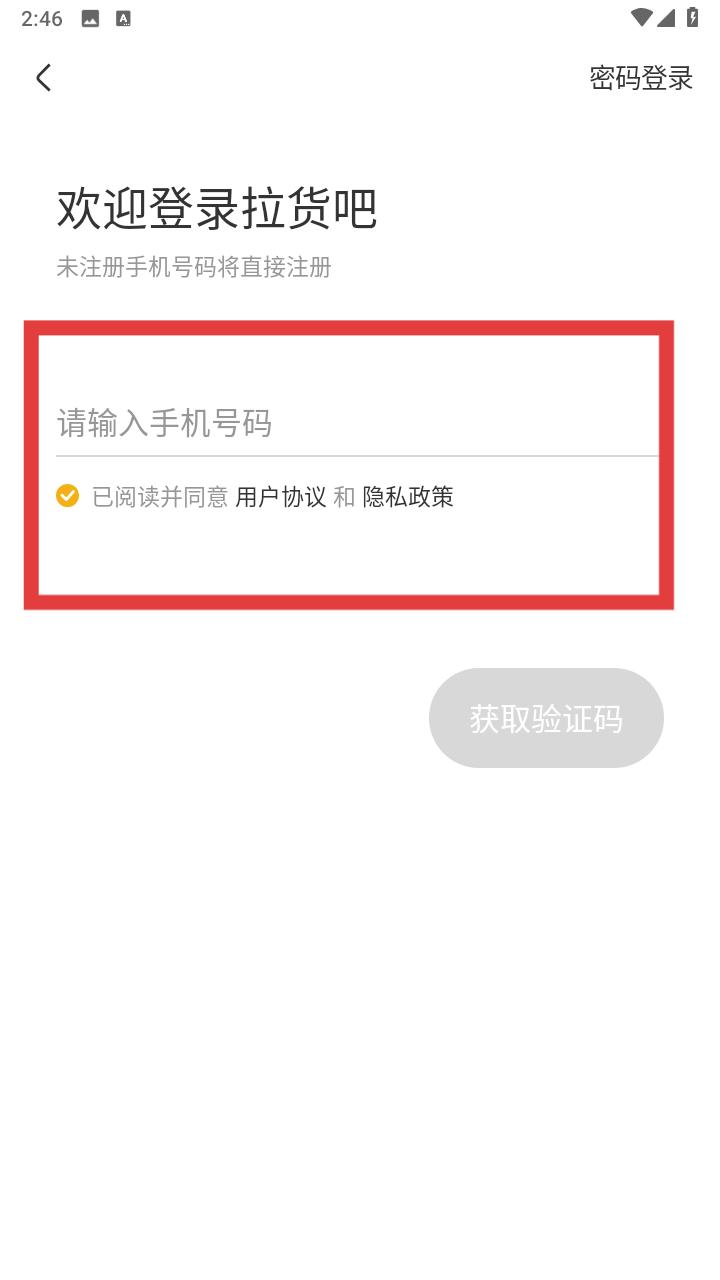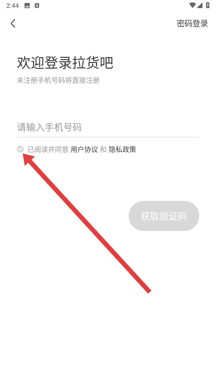 1、打開拉貨吧APP登錄界面,需要先點擊已閱讀并同意用戶協(xié)議和隱私政策勾選框,才能方便后續(xù)的登錄操作。