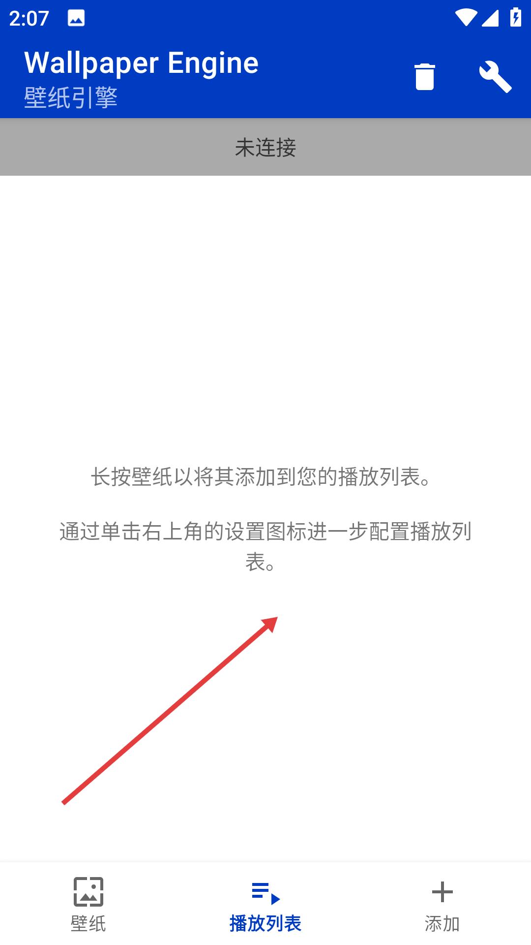2、進入播放列表頁面后,目前顯示為空,可長按壁紙將其添加到播放列表,也可點擊右上角設置圖標進一步配置。