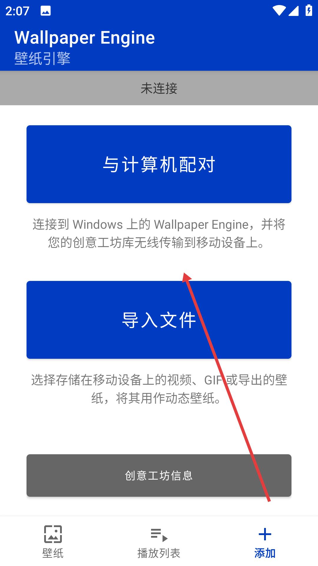 3、點擊下方添加按鈕,進入應用的添加頁面,可選擇與計算機配對或導入文件來添加動態(tài)壁紙。