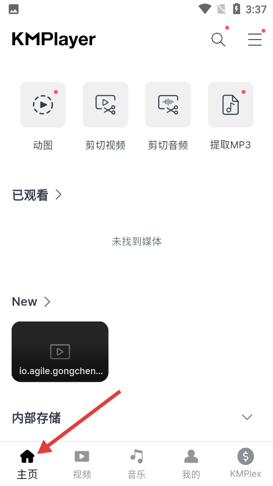 1、主頁(yè)布局簡(jiǎn)潔,設(shè)有動(dòng)圖制作、音視頻剪切等實(shí)用功能區(qū),下方呈現(xiàn)媒體觀看記錄及新內(nèi)容,底部導(dǎo)航欄可切換頁(yè)面。