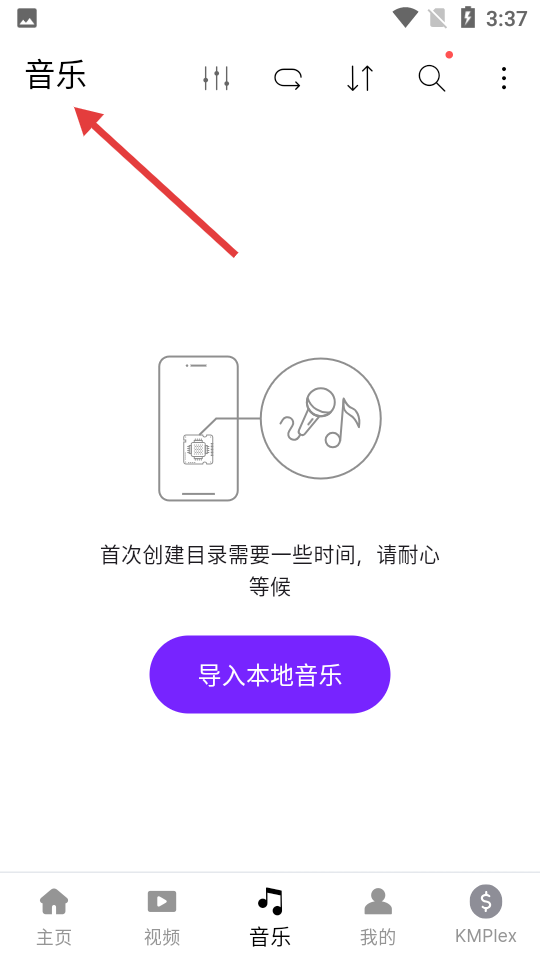 3、音樂頁(yè)面上方顯示音樂提示首次創(chuàng)建目錄耗時(shí),設(shè)有導(dǎo)入本地音樂按鈕,可助力用戶快速添加本地音頻。