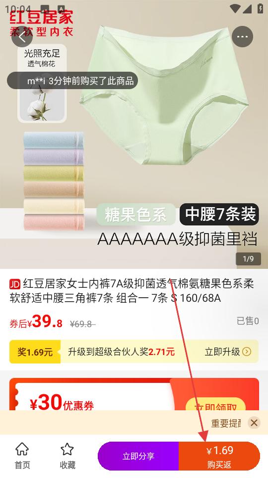 3、在商品詳情頁,確認購買意向后,點擊底部購買返按鈕,按照提示完成下單操作,享受返利優(yōu)惠,結束購物流程。