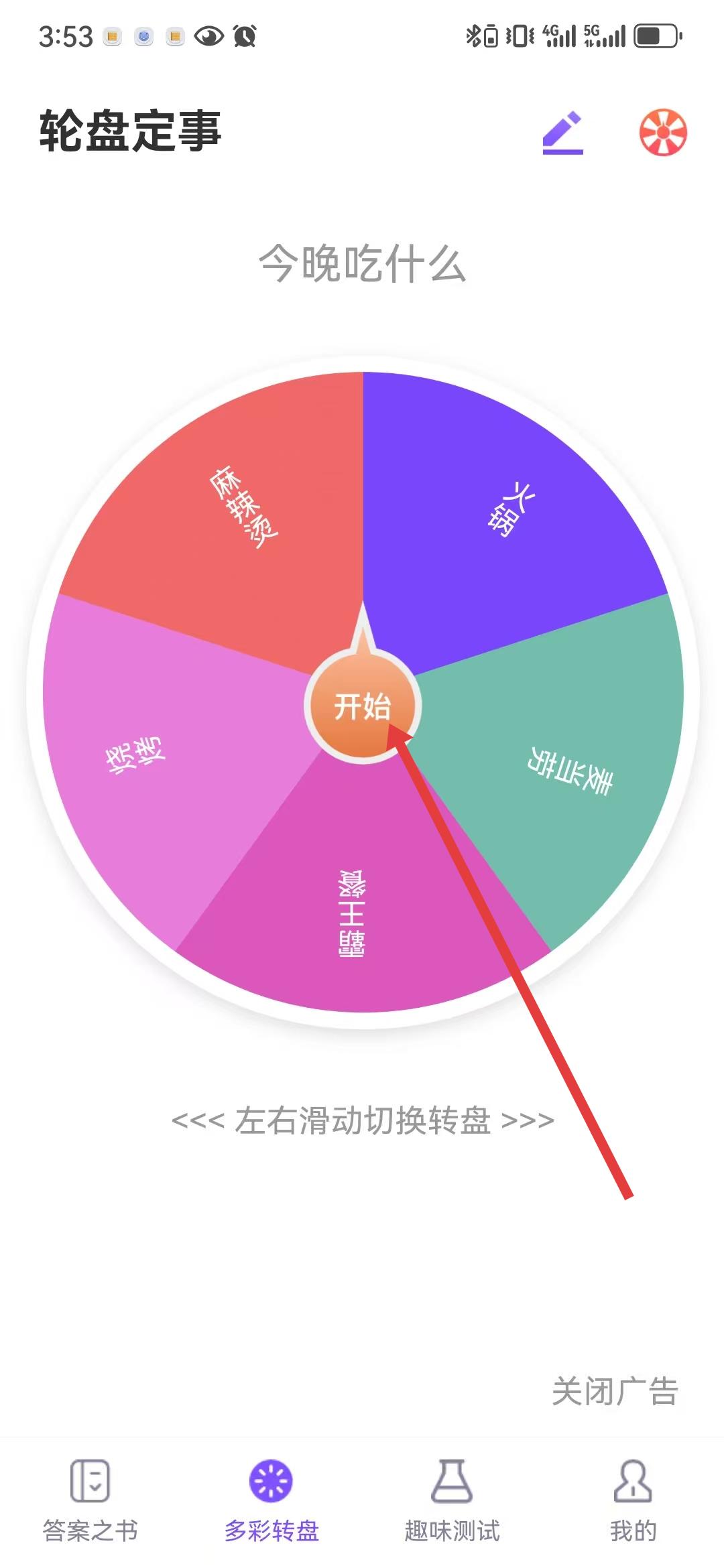 2、多彩轉(zhuǎn)盤(pán)板塊這里可以進(jìn)行輪盤(pán)定事,比如可以設(shè)置今晚吃什么這樣的主題,點(diǎn)擊中間的開(kāi)始按鈕輪盤(pán)就會(huì)轉(zhuǎn)動(dòng),最終指針指向的選項(xiàng)就是隨機(jī)給出的結(jié)果。