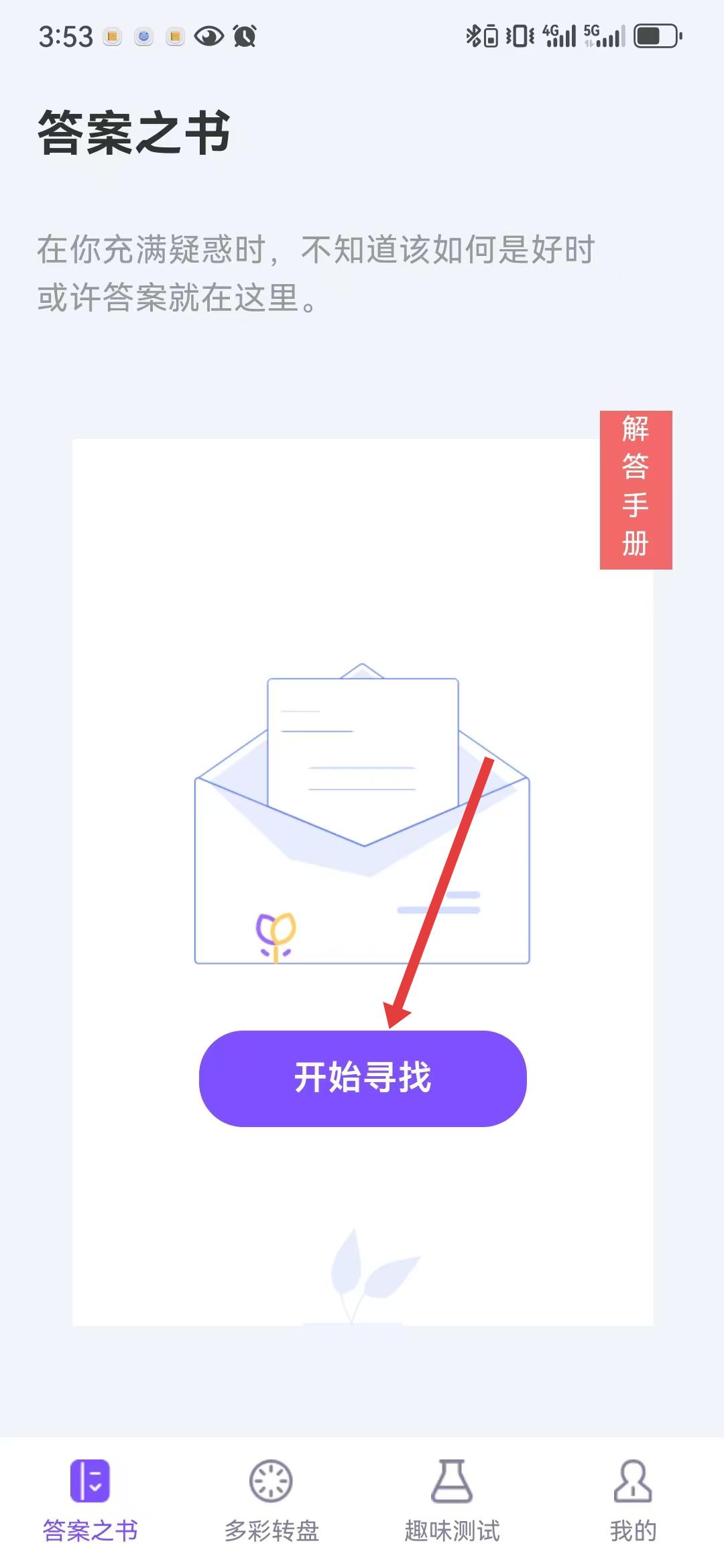 1、答案之書(shū)板塊這里會(huì)提示在你充滿(mǎn)疑惑不知如何是好時(shí)給你答案,點(diǎn)擊開(kāi)始尋找按鈕軟件會(huì)根據(jù)一定的算法隨機(jī)生成一個(gè)答案,給你在面對(duì)困惑時(shí)提供一個(gè)參考方向。