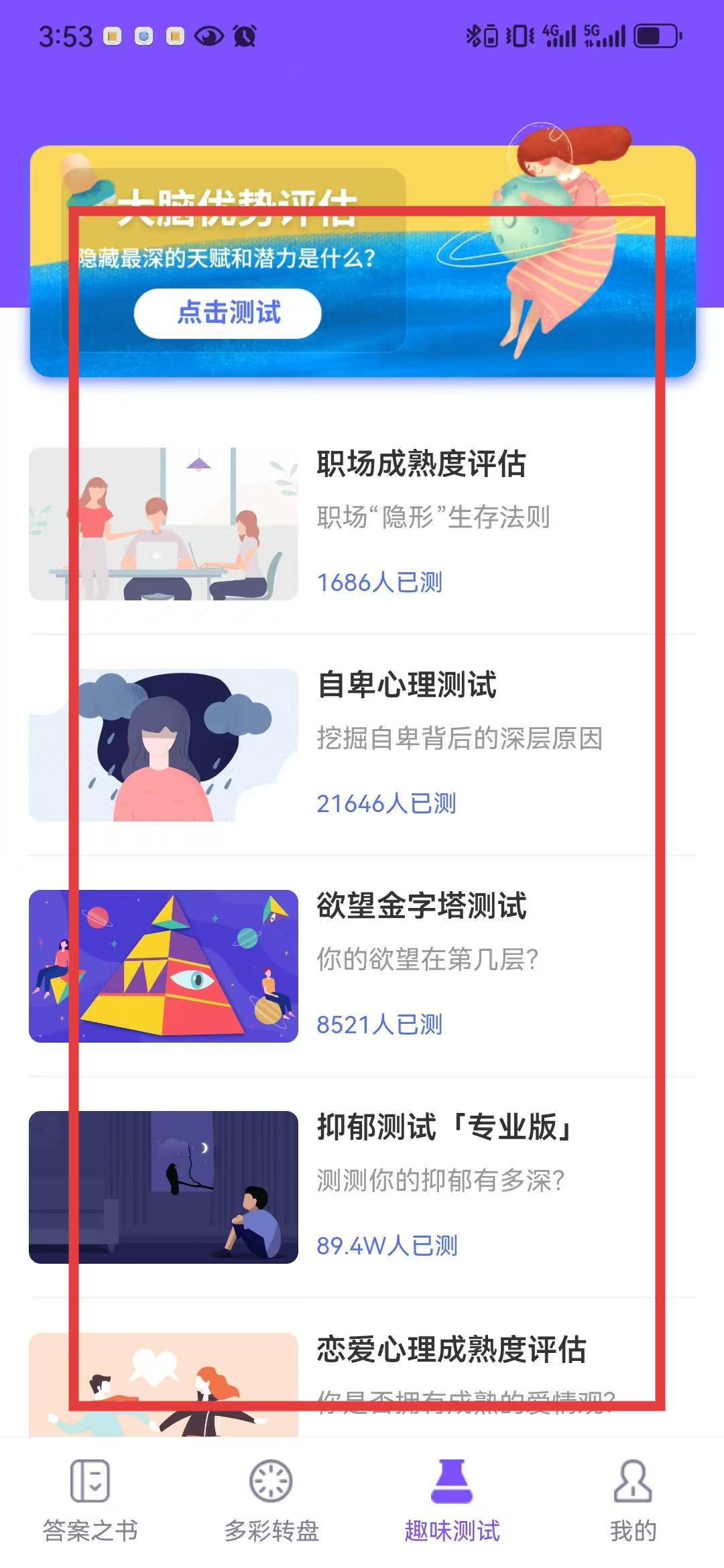 3、趣味測(cè)試界面有多種測(cè)試可供選擇,每個(gè)測(cè)試都有相應(yīng)的介紹和已測(cè)人數(shù),點(diǎn)擊感興趣的測(cè)試,按照提示完成答題就能得到測(cè)試結(jié)果,幫助你更好地了解自己。