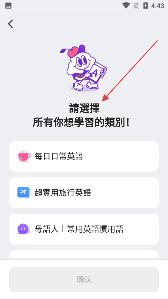 1、學(xué)習(xí)類別選取頁面,可愛角色下方提示選擇學(xué)習(xí)類別,有每日日常英語、超實用旅行英語等選項待確認(rèn)。