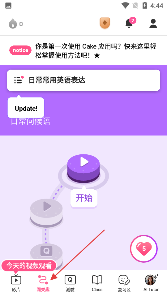 2、主界面新用戶提示醒目,顯示日常常用英語表達(dá)課程,底部導(dǎo)航欄涵蓋影片、闖關(guān)趣等多樣功能。