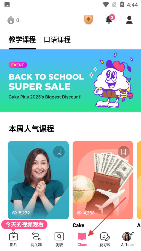 4、教學(xué)課程界面BACK TO SCHOOL SUPER SALE活動亮眼,本周人氣課程羅列其中可切換教學(xué)與口語課程。