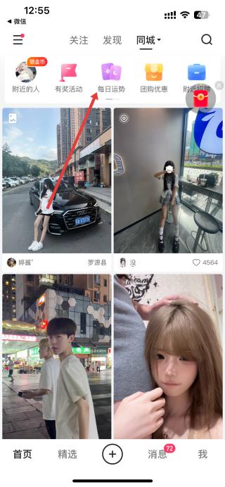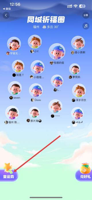 2、快手首頁,點擊每日運勢,進入同城祈福圈頁面,能看到眾多用戶頭像,還有查運勢和兌好禮按鈕。