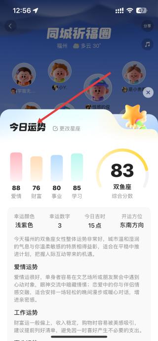 3、點擊查運勢,彈出今日運勢界面,可看到愛情、財富、事業(yè)、學習等方面的運勢分數(shù),以及幸運顏色、幸運數(shù)字等內(nèi)容。