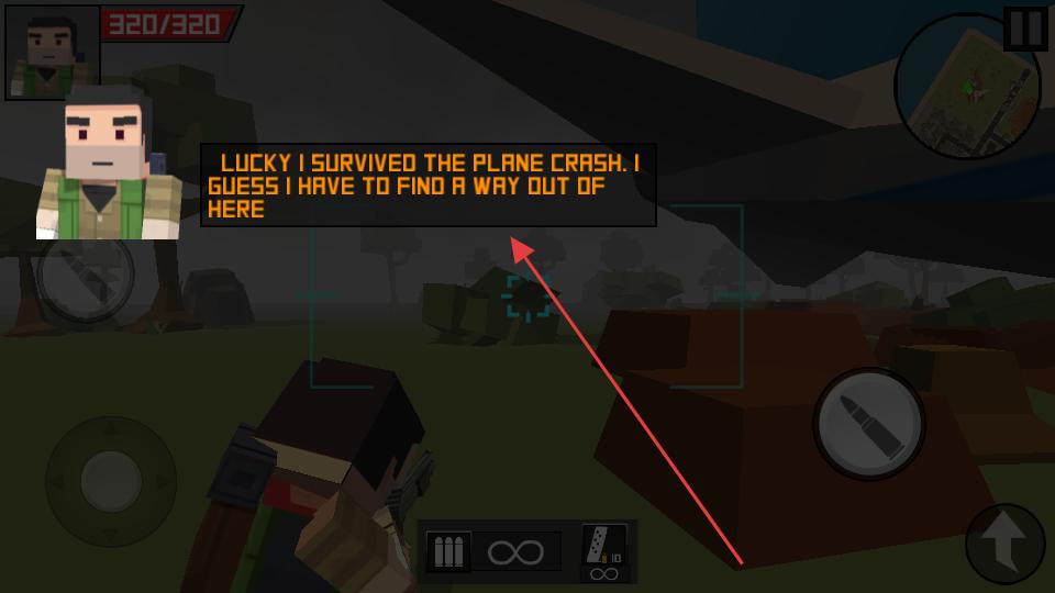 2、進入游戲場景,看到角色因飛機失事存活,需尋找出路,此時熟悉場景,為后續(xù)行動做準備。