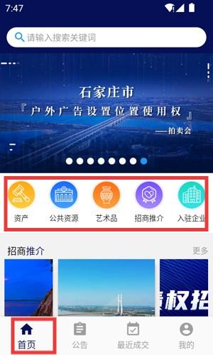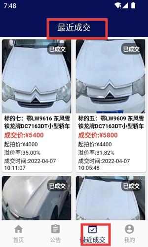 3、點擊底部導(dǎo)航欄最近成交選項,進(jìn)入最近成交頁面,展示已成交的拍賣標(biāo)的信息。