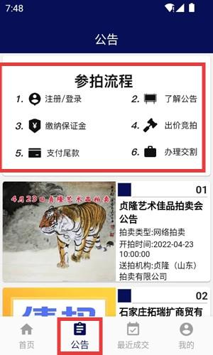 2、點擊底部導(dǎo)航欄公告選項,進(jìn)入公告頁面,上方清晰展示參拍流程,幫助用戶全面了解拍賣詳情。