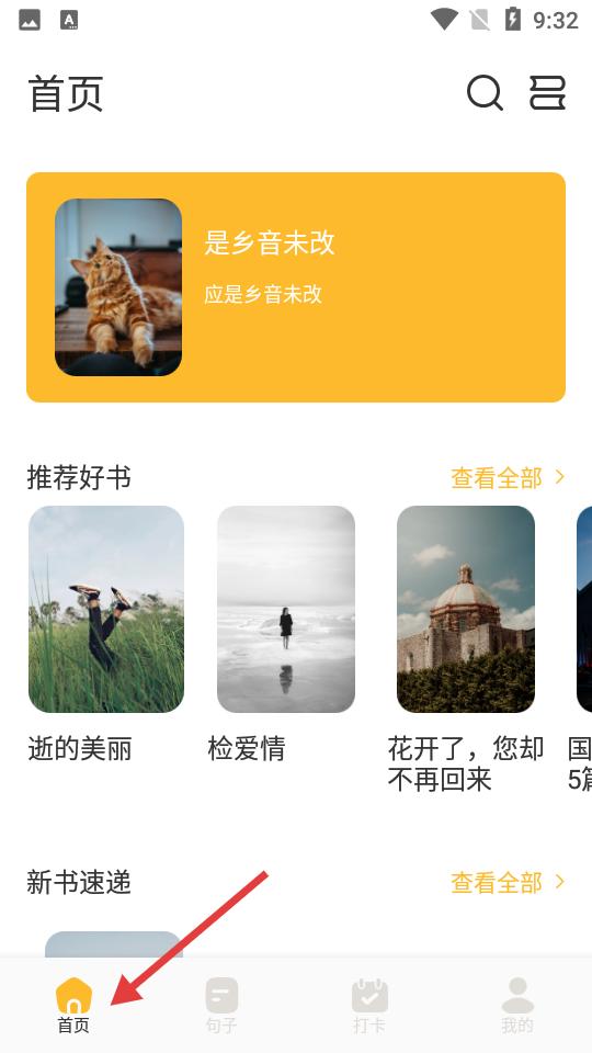 1、點擊首頁布局清新,展示用戶是鄉(xiāng)音未改卡片,設推薦好書、新書速遞板塊,帶來多元書籍選擇。