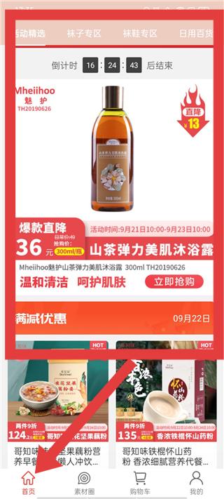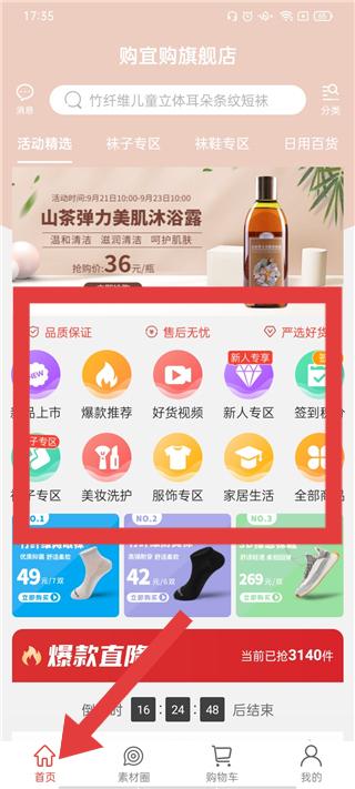 1、購宜購商城首頁,有購宜購旗艦店標(biāo)識,頂部是搜索欄,下方展示活動(dòng)商品山茶彈力美肌沐浴露還有品質(zhì)保證等功能入口及各品類分區(qū)、爆款直降區(qū)。