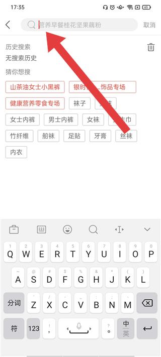 2、購宜購商城搜索界面,顯示搜索框內(nèi)的商品名,有歷史搜索和猜你想搜的品類推薦,如服飾、零食專區(qū)等方便用戶查找商品。