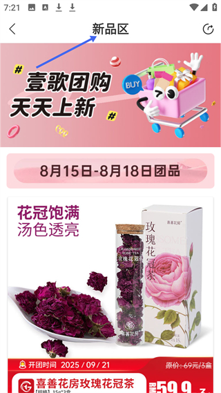 2、新品區(qū)宣傳壹歌團(tuán)購天天上新,展示8月15、18日團(tuán)品,有喜善花房玫瑰花冠茶,花冠飽滿、湯色透亮,開團(tuán)價(jià)實(shí)惠。