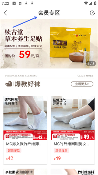 3、會(huì)員專區(qū)有續(xù)古堂草本養(yǎng)生足貼,團(tuán)購價(jià)59元袋,還有MG竹纖維抑菌船襪、網(wǎng)眼短襪,分別賣42元、49元是超值爆款。