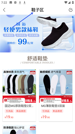 4、鞋子區(qū)有國邁輕便男款襪鞋,團(tuán)購價(jià)99元雙,還有高彈透氣的國邁MG厚款、薄款鞋墊,均售19.9元,新品首團(tuán)很劃算。