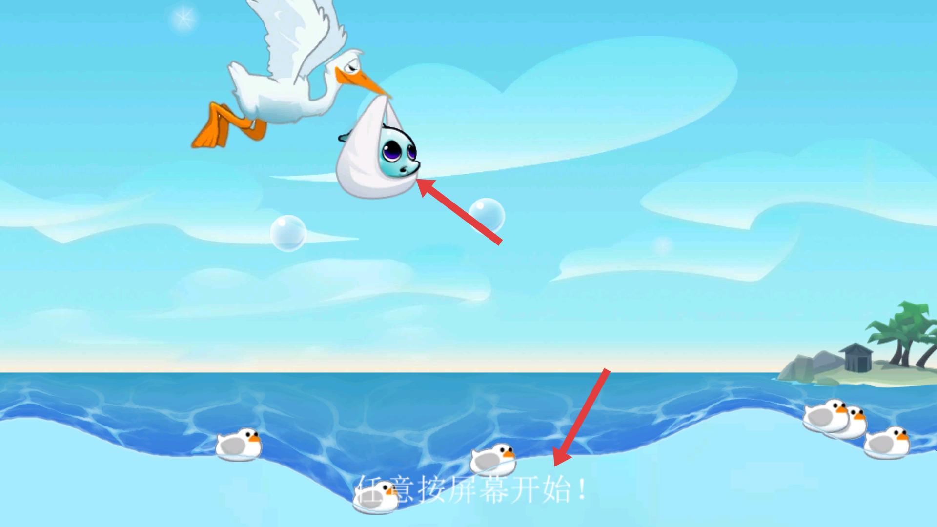 1、游戲初始界面,白鸛叼著魚,海面有小鴨,提示任意按屏幕開始,按屏幕后,魚會落入海中,開啟游戲,準(zhǔn)備操控魚在海中行動。