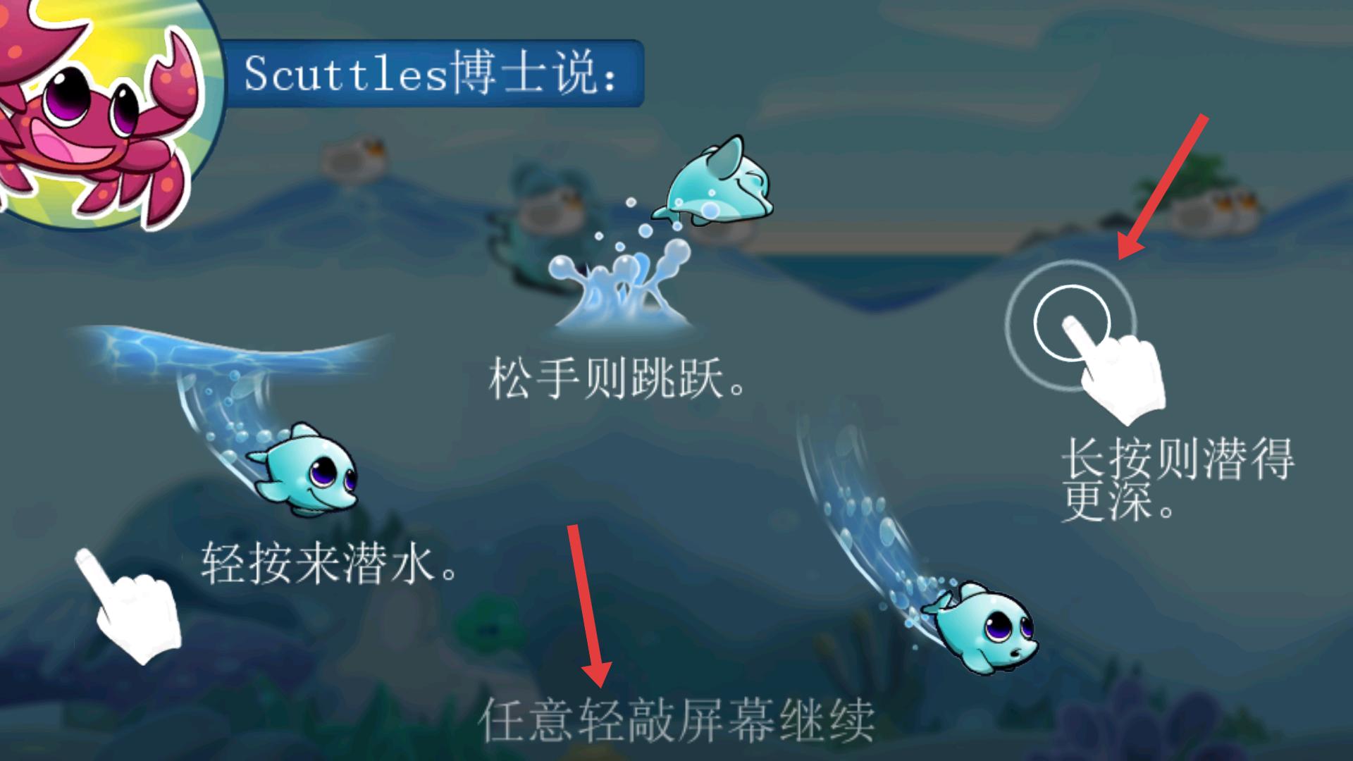 2、界面有Scuttles博士的操作提示,輕按潛水、長按潛更深、松手跳躍,了解這些操作后,任意輕敲屏幕繼續(xù),開始實(shí)踐操控魚的移動。