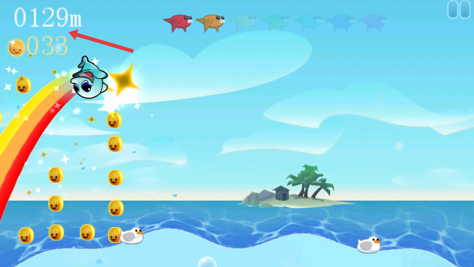 3、玩家操控魚在海面活動,通過跳躍等動作收集金幣,界面顯示已行129m、金幣33個,要繼續(xù)保持操作節(jié)奏,多收集金幣,提升成績。