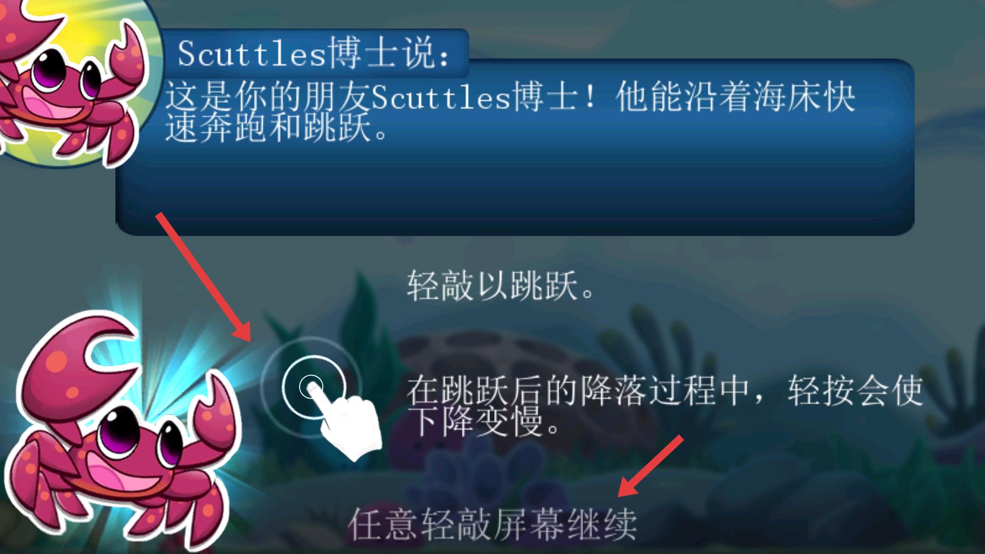 4、出現(xiàn)Scuttles博士介紹,它能沿海床快速跑跳,輕敲可跳躍,跳躍降落時輕按減慢下降,了解后任意輕敲屏幕繼續(xù),使用博士繼續(xù)游戲。