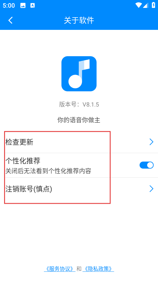 3、進(jìn)入關(guān)于軟件頁面有實用設(shè)置,有檢查更新、個性化推薦、注銷賬號功能,用戶按需操作這些選項,能讓軟件更貼合個人使用習(xí)慣,優(yōu)化用戶的使用體驗。