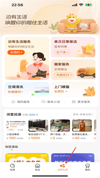 3、泊有生活板塊提供單次日常保潔、搬家等服務(wù),還有閑置撿漏和社區(qū)活動(dòng),豐富租客生活,滿足多樣需求。